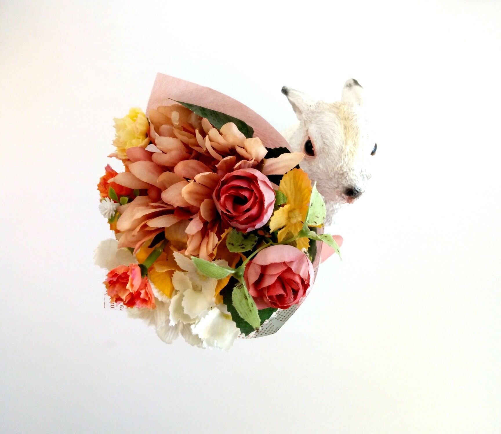 可愛らしい、うさぎの置物がブーケを持ってます。