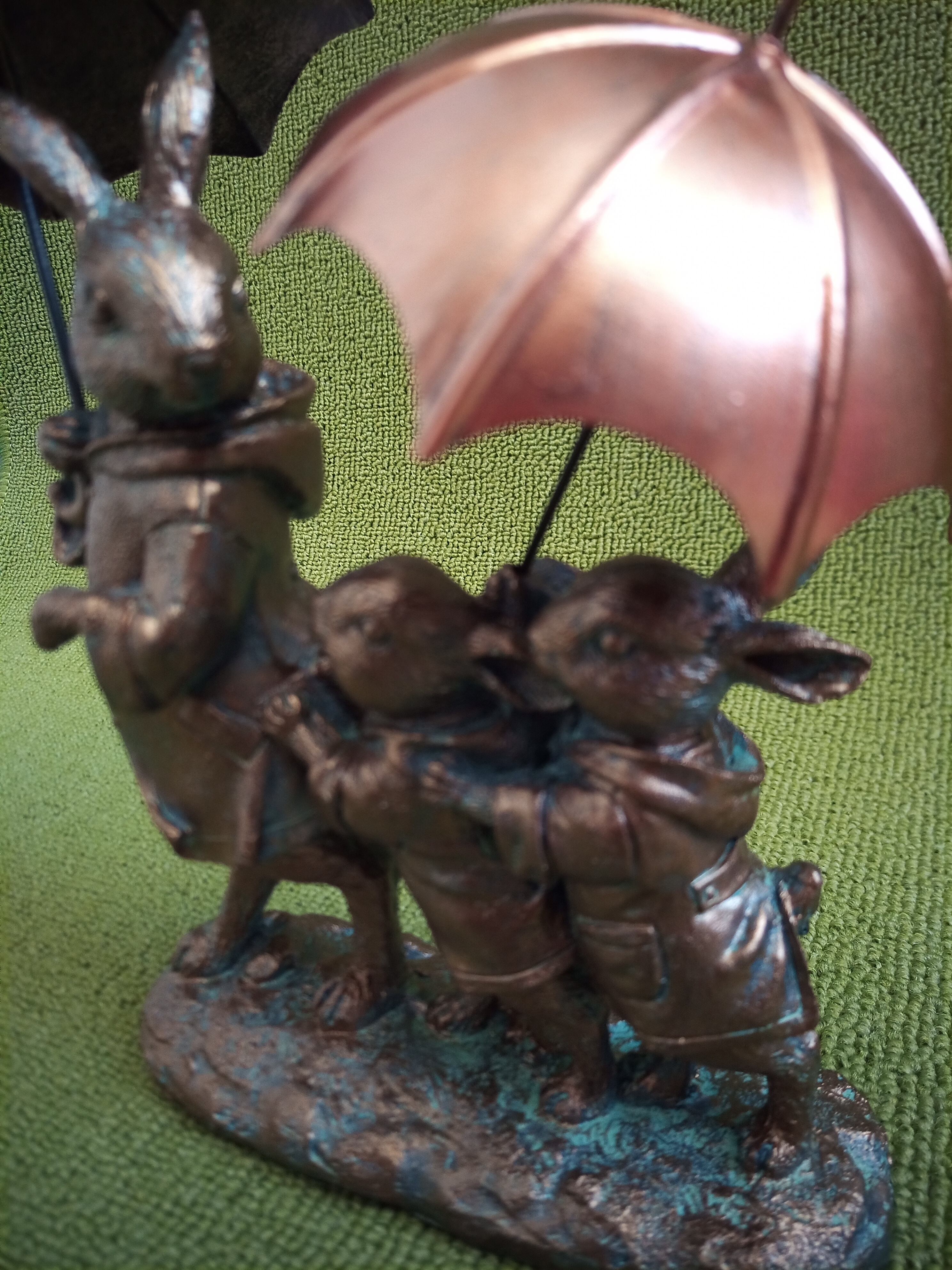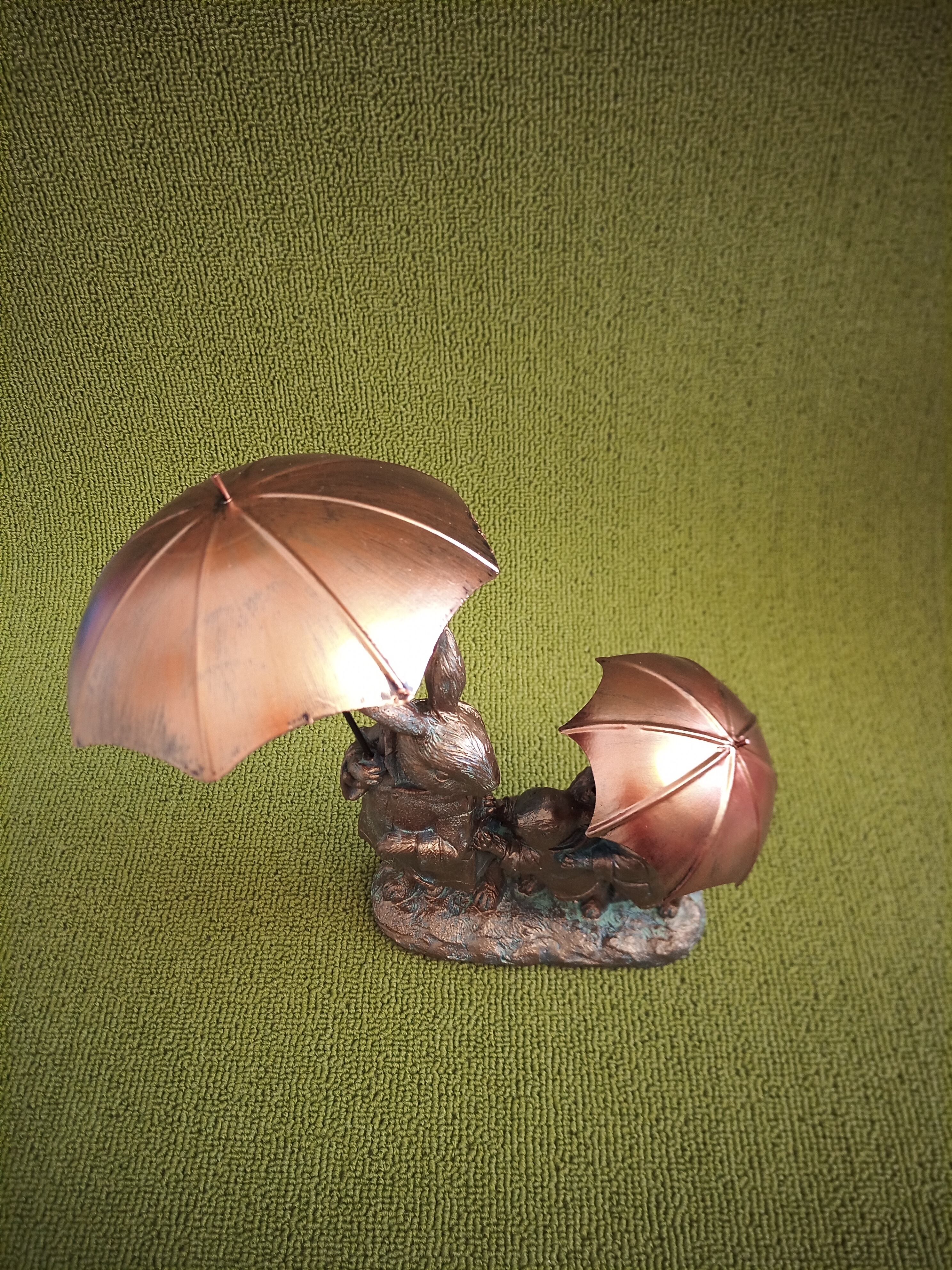ブロンズ調の傘を挿すうさぎの親子の姿が可愛らしい置物です。