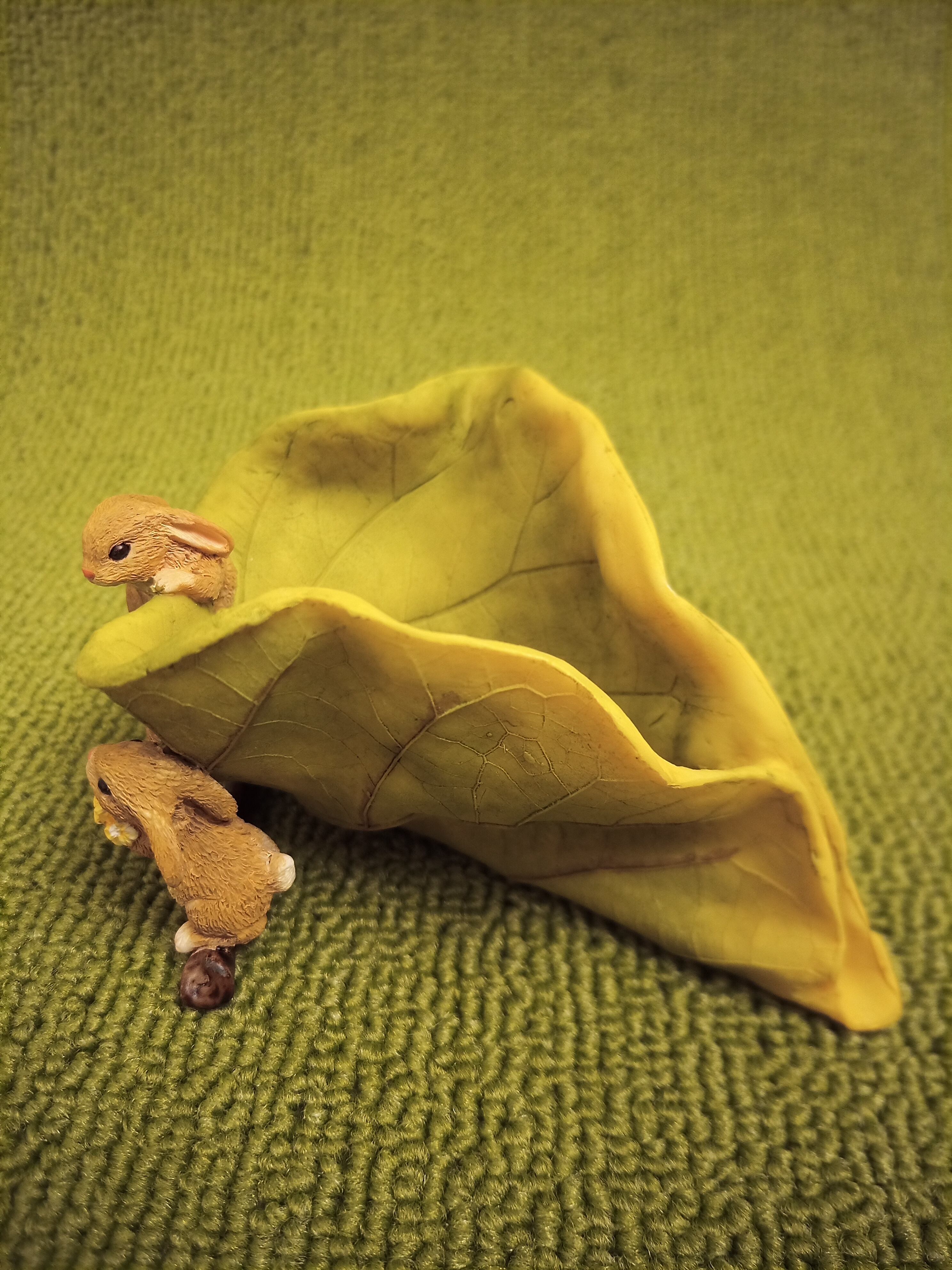 精巧な葉っぱと可愛らしい2羽のうさぎの小物入れです。
