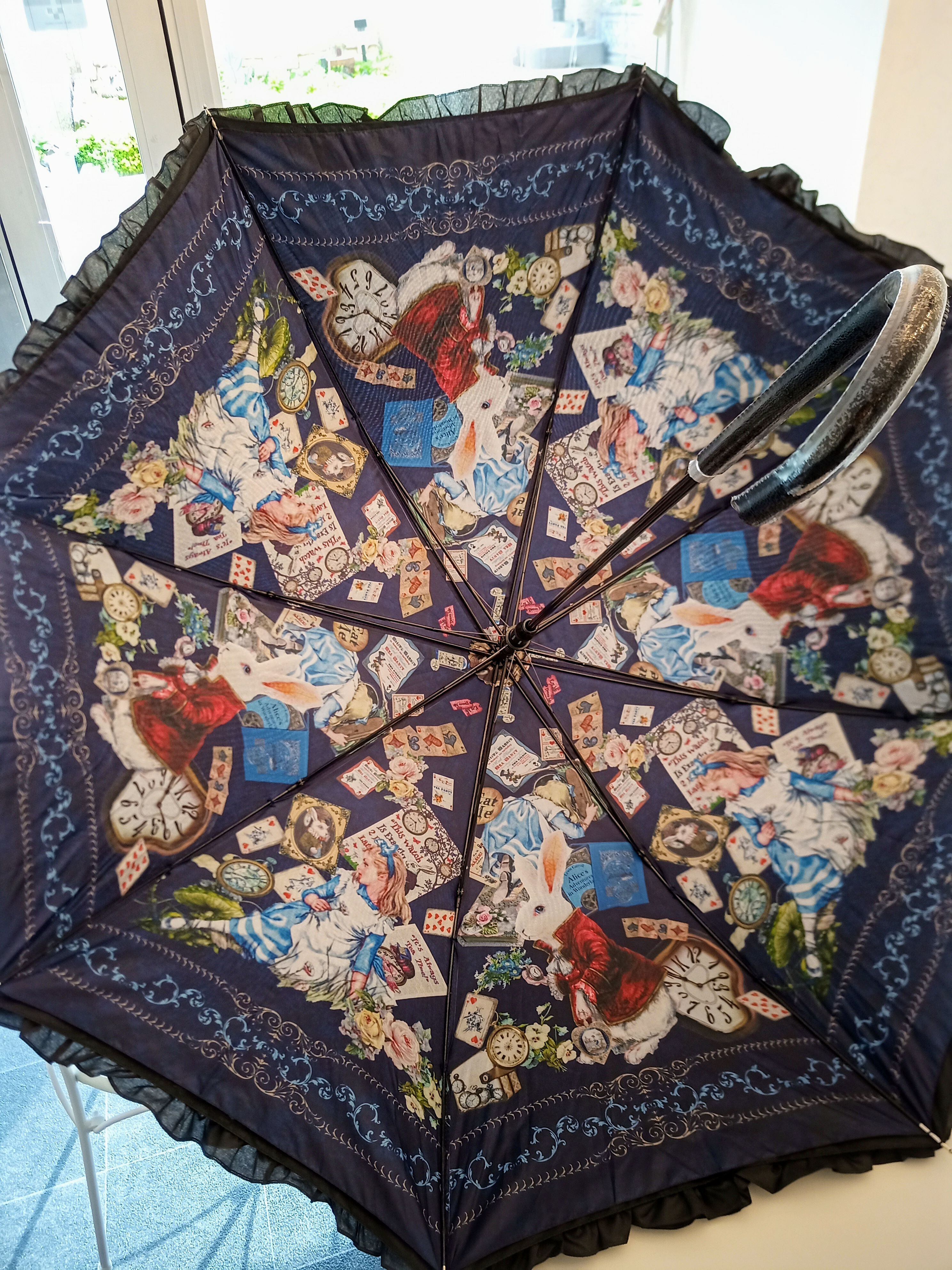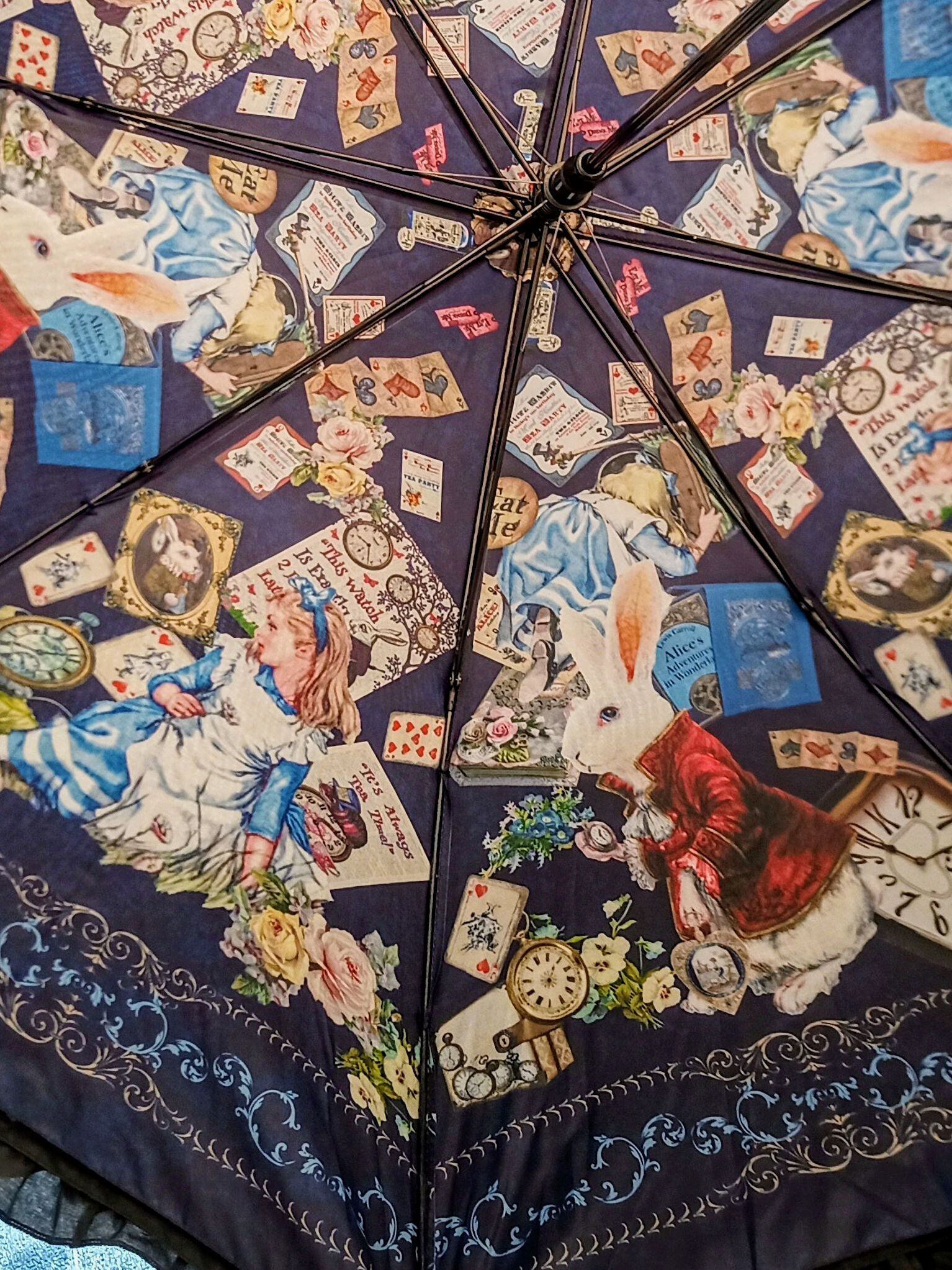 傘の内側には「不思議の国のアリス」のイラストがプリントされていて、雨の日も晴れの日も上を見上げれば、メルヘンの世界に引き込まれます♪